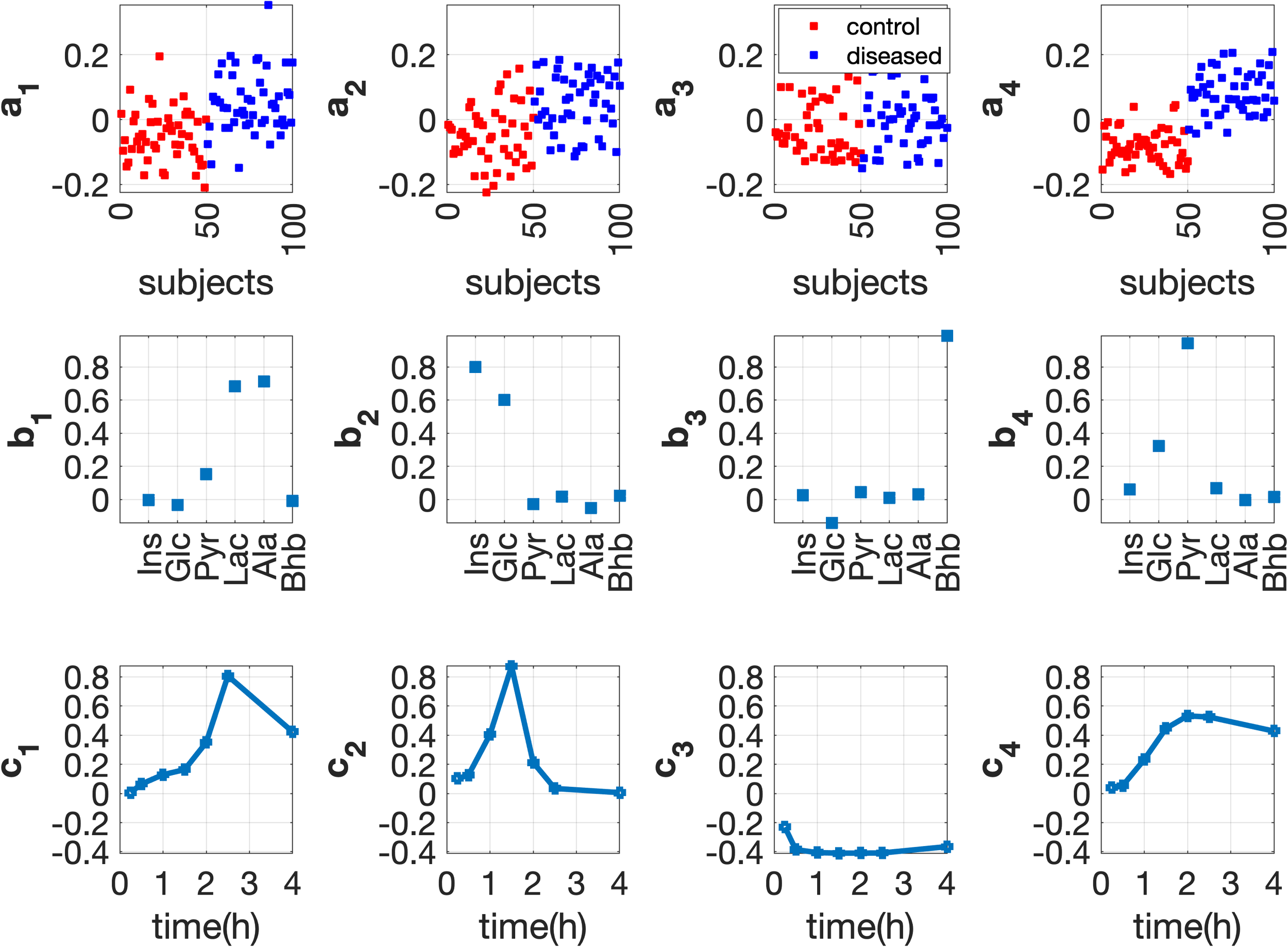 Patterns extracted by a 4-component CP model from a subjects by metabolites by time array.
